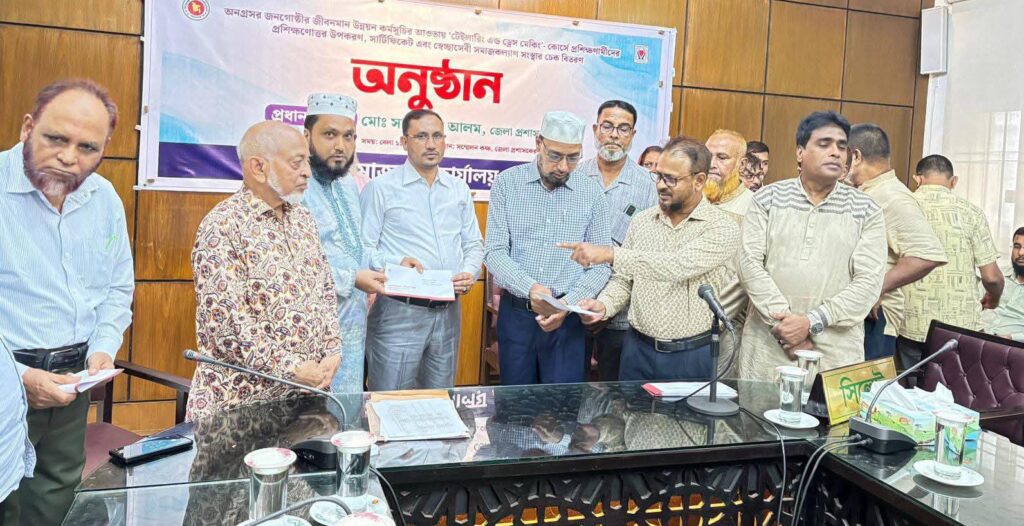 The President and General Secretary of Nakshi Bangla Foundation are receiving the check while attending a financial donation ceremony among voluntary organizations at the conference room of the District Administrator’s Office, organized by the District Social Services Office, Sylhet. 10.9.2025