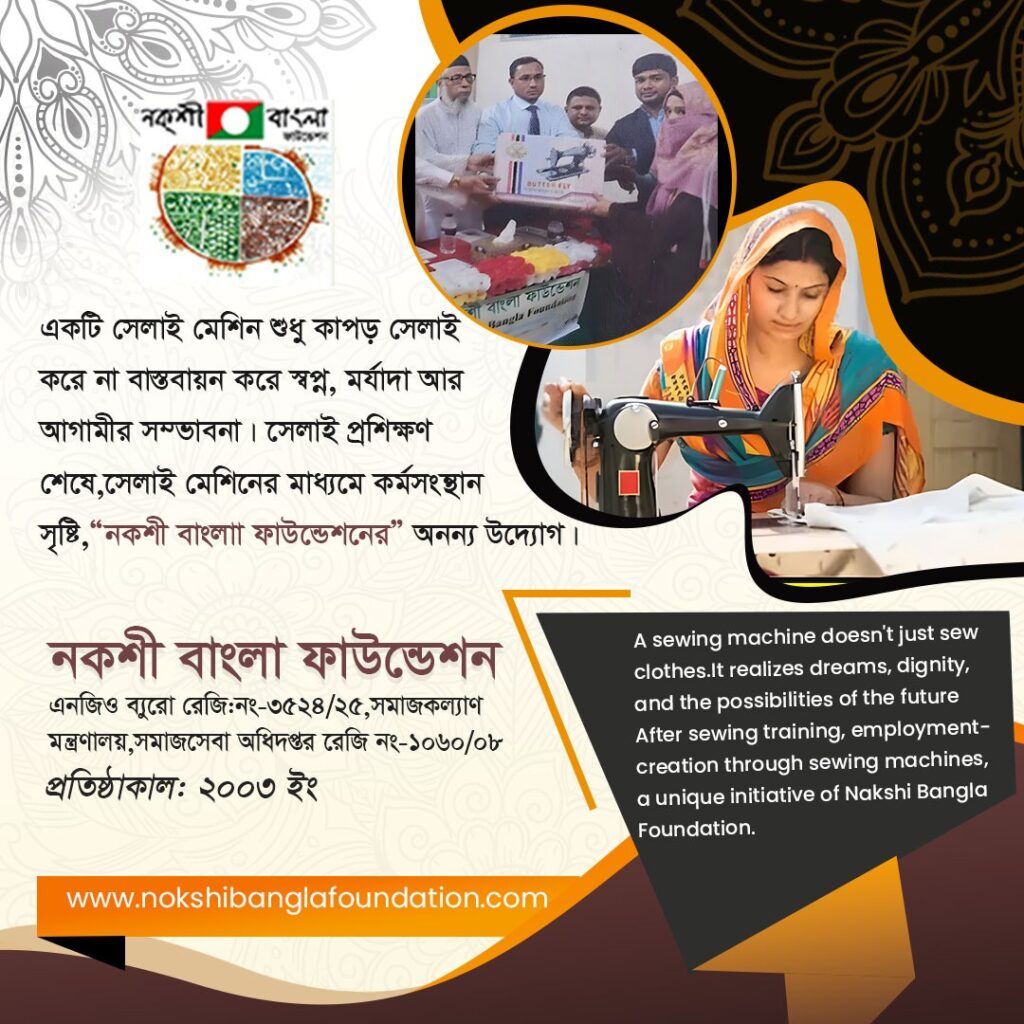 সেলাই প্রশিক্ষণ শেষে, সেলাই মেশিন প্রদান করে উদ্যোক্তা ও কর্মসংস্থানের ব্যবস্থা করতে “নকশী বাংলা ফাউন্ডেশন” অনন্য উদ্যোগ নিয়েছে।